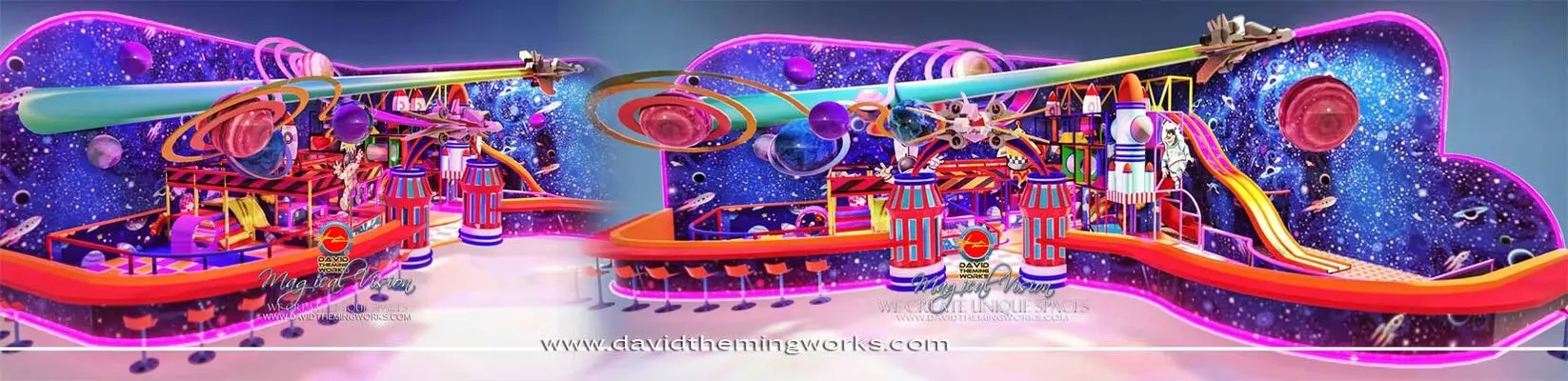 Design project for an indoor family theme park based on a cartoon aesthetic of space and science fiction.